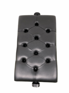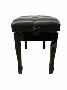 This is an adjustable piano bench featuring a padded, tufted black leather seat. The cushion has deep button-style tufting that gives it a classic, elegant look. On both sides of the seat, there are round adjustment knobs used to raise or lower the seating height. The bench has a sturdy black wooden frame with slightly curved legs, giving it a traditional and refined appearance. It is typically used for piano or keyboard playing, offering both comfort and height adjustability.